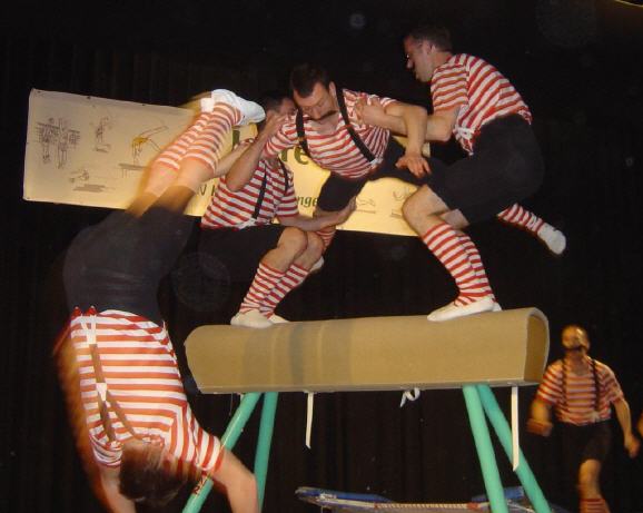 | Keine Unbekannten in Neulingen sind die gekonnt tollpatschig fliegenden Turner aus Obergrombach. Sie haben mit ihrer lustigen und akrobatischen Trampolinnummer mit vorausgehender fetziger Gymnastik das Publikum begeistert. |
