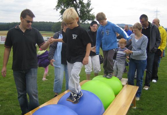 | Bewegung am großen Fallschirm, Laufen über wackelige Hängebrücken, Balancieren auf Pezzibällen, Sprung aufs Trampolin und was natürlich nicht fehlen durfte war das Schubkarrenrennen. |