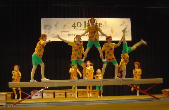 | Und dann ging es Schlag auf Schlag: Hey Pippi Langstrumpf – hieß das Motto des Auftritts unserer Wettkampfturnerinnen unter der Leitung von Tanja Reimann, die eine bunte Turnschau mit Seil und am Schwebebalken, mit Tanz, Bodenturnen und Showelementen zeigten. |