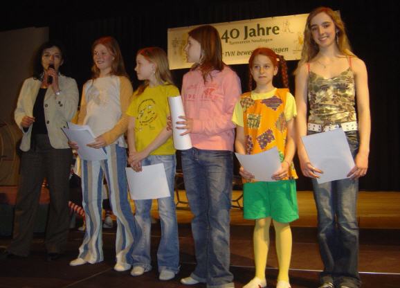 | Nicht im Programm stand was danach folgte: unsere Turngauvorsitzende Sonja Eitel kam direkt vom Bezirksentscheid der Turner und brachte eine faustdicke Überraschung mit: unsere Schülerinnen C und E haben beim Bezirksentscheid in Heidelsheim vordere Plätze belegt. Sie waren direkt nach dem Wettkampf schnell nach Neulingen zurückgefahren und erst kurz vor ihrem Auftritt in der Gräfin-Rhena-Halle eingetroffen. Sie wussten also noch nicht, dass die Schülerinnen C mit Ariane Berzel, Nadine Mertens, Karen Heise, Ann Catrin Nonnenmann und Shari Uhlig den ersten Platz erreicht hatten. Unsere Schülerinnen E belegten Platz zwei (Bericht folgt). Ein großer Applaus des Publikums für diese tolle Leistung gehörte unseren Leistungsturnerinnen. |