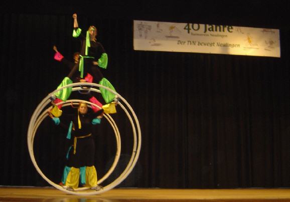 | Große Räder – großer Turnsport – damit ist kurz umschrieben, was die Röhnradturner des Turnerbunds Wilferdingen mit ihrer Showgruppe zur Musik von ABBA auf die Bühne brachten. |