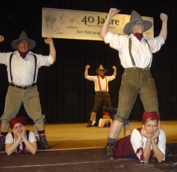 | Unsere Dirndl-Jäger kommen nicht aus dem Alpenraum! Gemeinsam mit ihren Madeln in ihren feschen Dirndl brachten Sie die Halle zum Beben. Sie sind allesamt im TV Neulingen zu Hause. Auch unsere Vorstandsriege und unsere Übungsleiter und Übungsleiterinnen sind in dieser TVN-Tanzgruppe gut vertreten. Dabei waren Gundi Bäuerlein, Andrea Demel, Renate und Bernd Eid, Monika und Wolfgang Hirsch, Beate Kessler, Sabine Kolb, Gordon Kormendi, Melanie Lewender, Lutz Rischert, Dieter Stiefel, Bernd Stroh und Stefanie Zipse. |