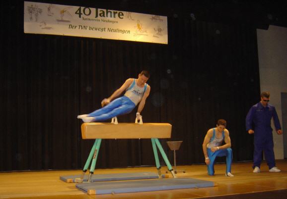| Ganz besonders stolz sind die Verantwortlichen des TVN, dass es unserer Iris Stiefel gelungen ist, am Abend vor einem wichtigen Bundesligawettkampf gegen Cottbus, vier der besten Turner Deutschlands, Alexei Griegoriev, mehrmaliger Russischer Meister und Europameister, die Zwillingen Achim und Roland Wackenhut, beide mehrfache Deutsche Meister sowie Dirk Walterspacher – nach eigenen Angaben „der Turnopa der Gruppe“ – Deutscher Vizemeister und mehrfacher Baden-Württembergischer Meister für die Sportschau zu verpflichten. |