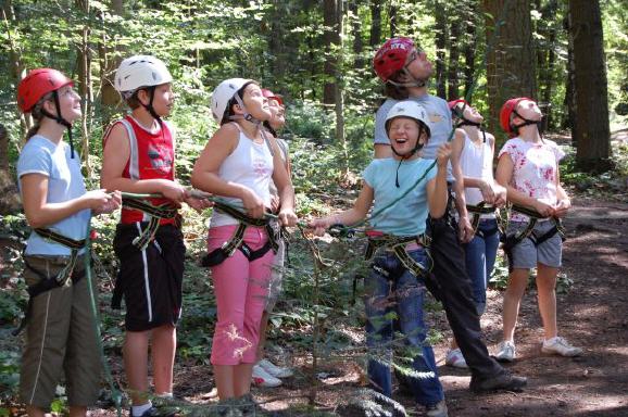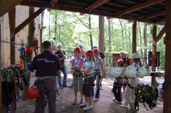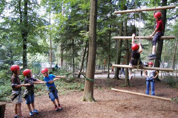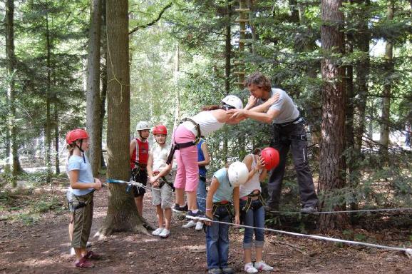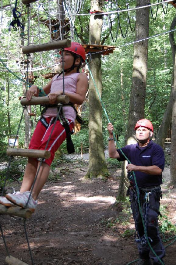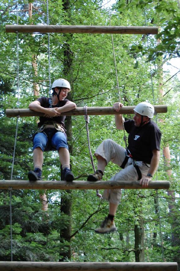 | sie kletterten an einer Hängeleiter in die Baumwipfel und von dort aus balancierten sie – möglichst freihändig – auf einem schaukelnden Balken zur nächsten Baumkrone und wieder zurück. Danach die ultimative Mutprobe: der freie Fall aus schwindelnder Höhe vorwärts in die Tiefe ins Seil – eine absolute Überwindung. |