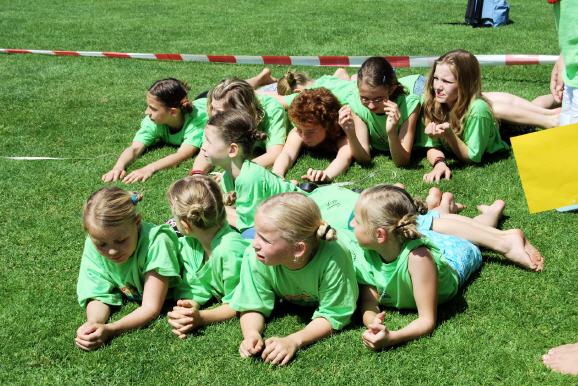 | Anschließend wurden noch die letzten Kraftreserven für die „Kinderturnfest-Erlebnis-Rallye“ mobilisiert. Bei „Huckepack mit verbundenen Augen“, „Getränkekistentransport“, „Hüpfball“, „Gedicht schreiben“ usw. ging es nochmals recht lustig zu. |