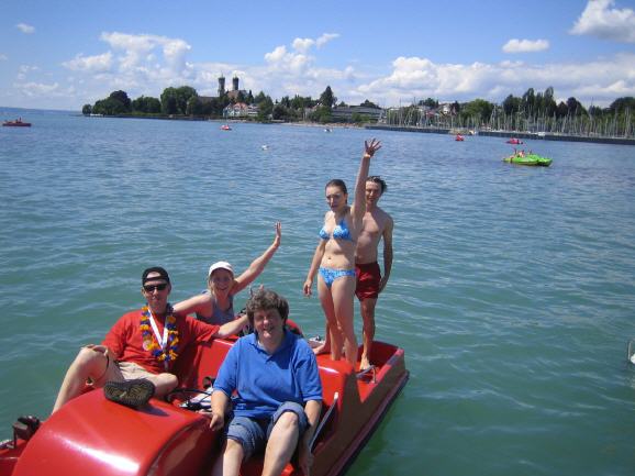 | Gemeinsam mit Andi und Ralf von der TG Stein bzw. vom Turngau verbrachten wir vergnügliche Stunden bei den Mitmachangeboten Rope-Skiping und Bodensee-Test – welchen alle bestanden haben – sowie beim Tretboot fahren auf dem Bodensee verbunden mit einem „Sprung ins kühle Nass“ und „Sonnenbrand“. |