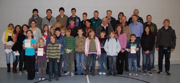 Die Leichtathletikabteilung hat in der letzten Trainingsstunde des vergangenen Jahres wieder Rückblick gehalten auf die sportlichen Ereignisse und die herausragenden Ergebnisse ihrer Athletinnen und Athleten. Im Beisein vieler Eltern wurden Urkunden übergeben, Kreismeister geehrt und zum Abschluss an Kinder, Jugendliche und Erwachsene die Sportabzeichen verliehen. Folgende Sportlerinnen und Sportler haben beim TVN das „Deutsche Sportabzeichen“ im Jahr 2009 errungen: Deutsches Sportabzeichen Jugend in Bronze Carina Kienzler, Adina Wilde, Daniel Hofsäß, Pascal Wilde Deutsches Sportabzeichen Jugend in Silber Vanessa Dietrich, Oliver Bittigkoffer, Lukas Fränkle, Luca Pflittner Deutsches Sportabzeichen Jugend in Gold Vivien Polten, Lukas Hirsch Deutsches Sportabzeichen Jugend in Gold mit Zahl 4 Alisa Furch, Deborah Hofsäß, Lisa Sulzer, Julius Klein Deutsches Sportabzeichen Jugend in Gold mit Zahl 5 Greta Esdar, Jasmin Dietrich, Tabea Hofsäß, Denis Vollmer, Anon Furch Deutsches Sportabzeichen Jugend in Gold mit Zahl 6 Sarah Haupt, Lisa Kühner Deutsches Sportabzeichen Jugend in Gold mit Zahl 7 Fabian Steinmann Deutsches Sportabzeichen Jugend in Gold mit Zahl 8 Hannah Bittigkoffer Deutsches Sportabzeichen Jugend in Gold mit Zahl 9 Patrick Steinmann Deutsches Sportabzeichen Jugend in Gold mit Zahl 10 Lucas Bittigkoffer, Jonas Klein Deutsches Sportabzeichen in Bronze Nadine Weigel Deutsches Sportabzeichen in Silber Günther Bippes Deutsches Sportabzeichen in Gold Sandra Hofsäß, Dorothea Krenkel, Bärbel Sulzer, Stefan Hofsäß, Ruben Sulzer, Jens Radbruch (alle 5x) Martin Kazenmaier, Michael Volk (alle 6x) Heike Heise, Ralf Schäfer (alle 7x) Gundula Kazenmaier, Bernd Heise, Martin Straub, Dominik Stroh (alle 8x) Svenja Bittigkoffer, Petra Kiesel (9x), Sybille Stührk (12x), Cornelia Stroh (13x) Deutsches Sportabzeichen in Gold mit Zahl Bernd Stroh (10x) |