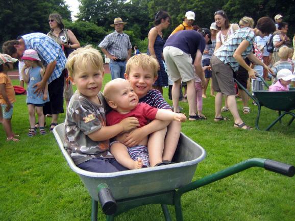 Auf dem Sportgelände waren verschiedene Stationen zu durchlaufen: Sprung aufs Trampolin, krabbeln durch Kriechtunnel, Bewegung am großen Fallschirm, klettern, rutschen, kullern an der schiefen Ebene, laufen über wacklige Hängebrücken und was natürlich nicht fehlen durfte war das Schubkarrenrennen (diesmal auch mit Sackkarren) |