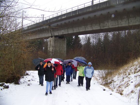 Von Gochsheim nach Oberacker und zurück 14 Wanderer trafen sich am Sonntag trotz nasskalter Witterung zur ersten Wanderung 2009. Der 13 km lange Wanderweg führte vom Industriegebiet Gochsheim vorbei am Naturschutzgebiet „Tonbergsee“ nach Oberacker. Dort ging es quer durchs Dorf bis zum Sportplatz. Am daneben gelegenen Grillplatz wurde in einer Hütte die erste Verschnaufpause eingelegt. Die Wanderer gingen dann trotz inzwischen eingesetztem Regen weiter durch den Frauenwald, unterquerten dort die Schnellbahntrasse und wanderten dann in Richtung Büchig bis zum Naturschutzgebiet „Ritterbruch“ Jetzt wurde der Rückweg nach Gochsheim eingeschlagen. |