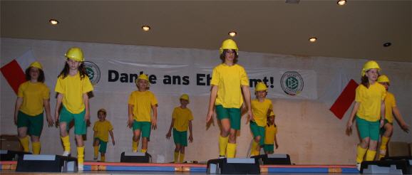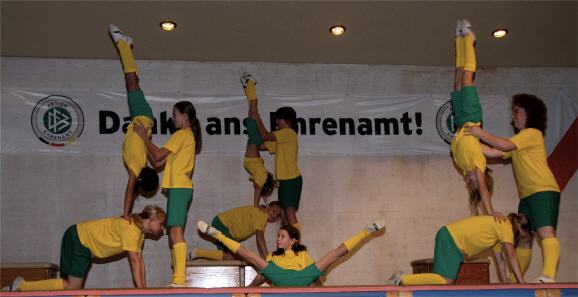 | Am 15.10.2010 umrahmte unsere Leistungsturngruppe mit einem Mix aus Step, Bodenturnen und Akrobatik das Festbankett anlässlich des 100 – jähringen Bestehens des 1. FC Nußbaum. |