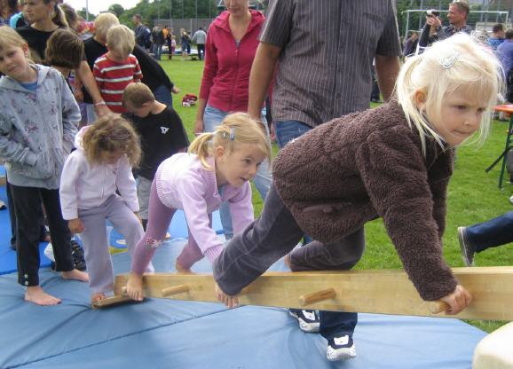 | Bewegung am großen Fallschirm, Laufen über wackelige Hängebrücken, Balancieren auf Pezzibällen, Sprung aufs Trampolin und was natürlich nicht fehlen durfte war das Schubkarrenrennen. |