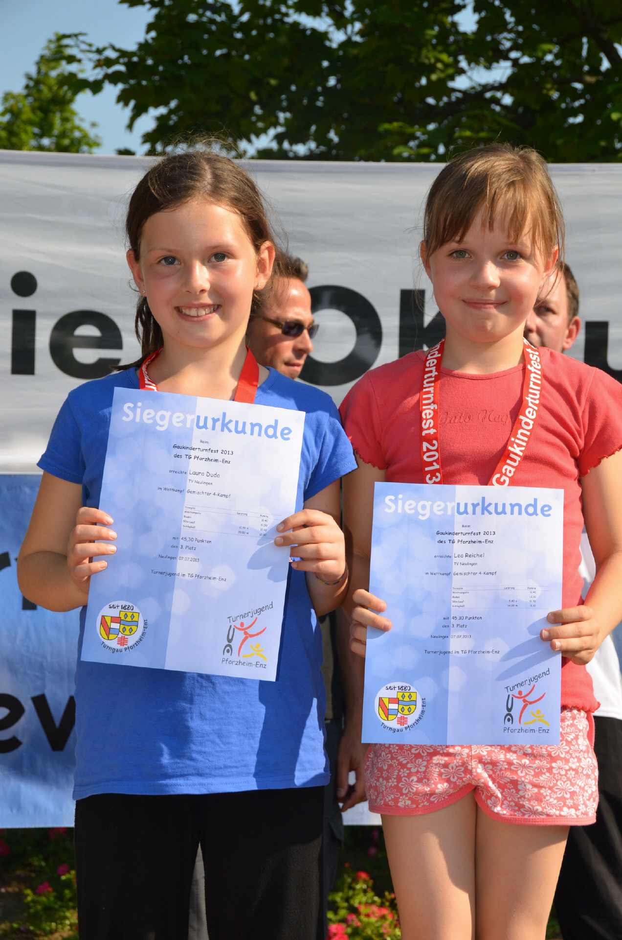 - 14 Podestplätze - 4 x Gold, 4 x Silber, 6 x BronzeBei strahlendem Sonnenschein nahmen 37 Mädchen und 5 Jungs am Gaukinderturnfest des Turngaues Pforzheim am 7. Juli 2013 teil, welches dieses Jahr direkt vor der Haustüre - in und um die Gräfin-Rhena-Halle in Bauschlott - stattfand. Einige sparten nicht mit ihren Kräften und nutzten tags zuvor auch schon die Möglichkeit zur Abnahme des Sportabzeichens beim Sportabzeichentag. |